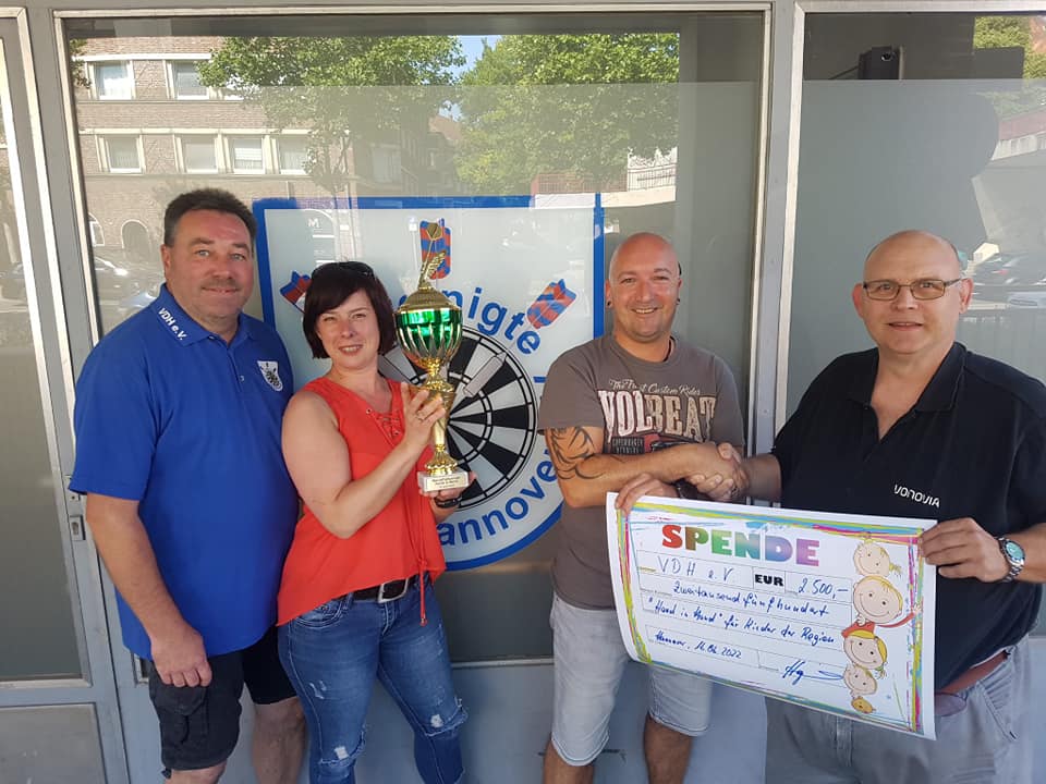Ihr habt ja mitbekommen das die Vereinigte Dartliga Hannover e. V. zu Gunsten für unseren Verein am 10.06.2022 ein Dart Benefizturnier mit 4 bekannten PDC Stars in Hannover ausgerichtet hat. Heute war die Spendenübergabe. Da es zeitlich nicht möglich war das der gesamte Vorstand dabei anwesend ist, sind Jessica und Daniel stellvertretend für uns alle in die heiligen Gemächer der VDH gefahren. Und nun die tolle Nachricht: Es ist insgesamt bei dem Turnier eine sagenhafte Summe von 2500€ zusammen gekommen!!! ❤️❤️❤️ Außerdem gab es noch für den Hand in Hand Vorstand einen tollen Pokal und die Aussage das die Vereinigte Dartliga Hannover uns in Zukunft immer wieder mit so tollen Aktionen unterstützen möchte! Wir sind super Happy und können uns immer nur wiederholen und ein ganz ganz großes Dankeschön aussprechen! Das was Ihr da geleistet habt und natürlich auch alle die gespendet haben, seid großartig! DANKE DANKE DANKE!!! Der gesamte Vorstand von Hand in Hand für Kinder der Region